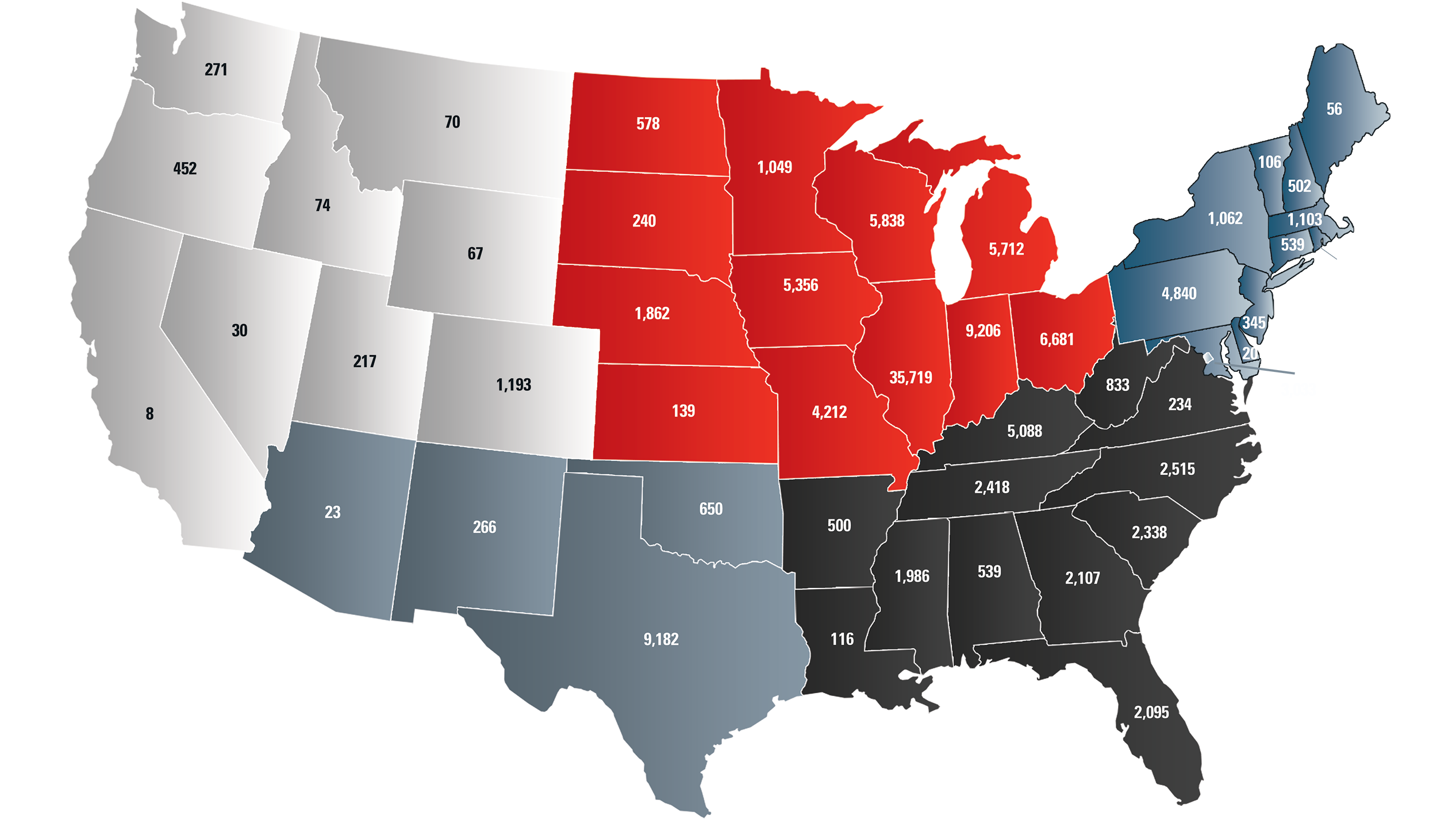 The numbers on the map represent the location of final deliveries completed in 2025.